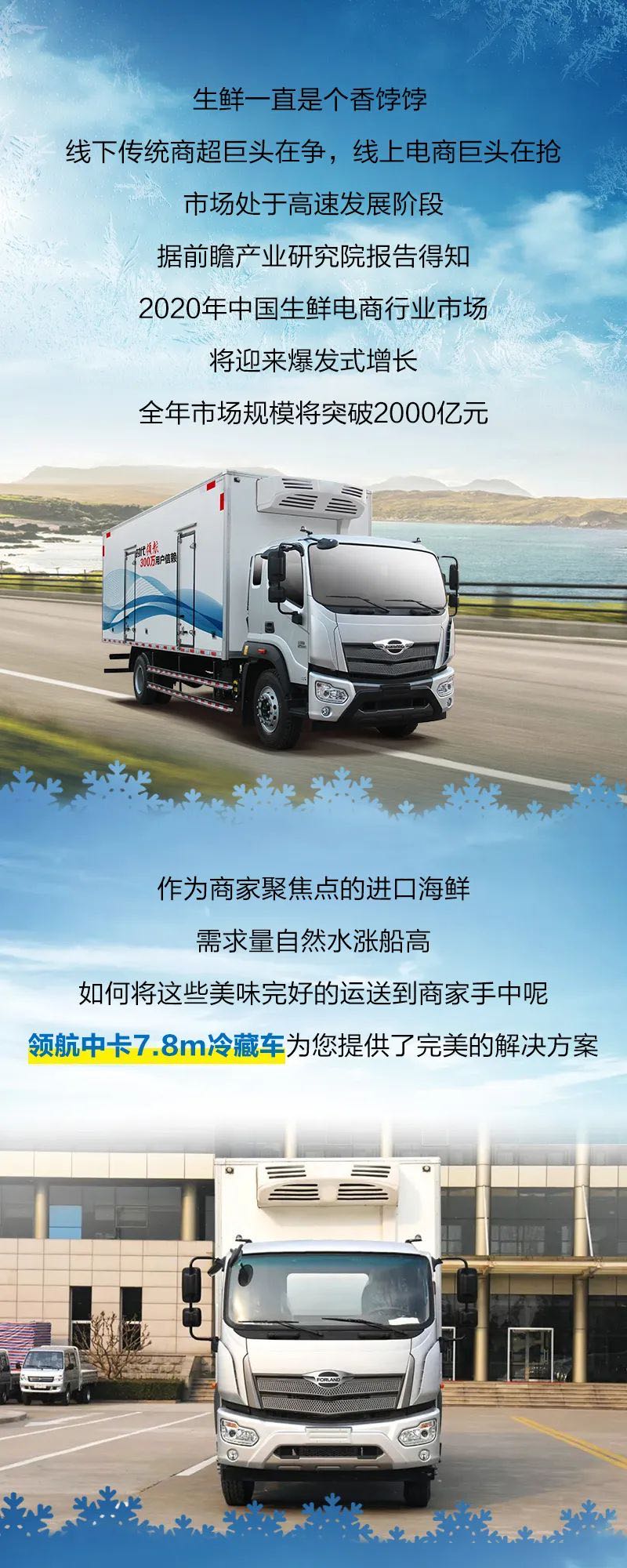 領航中卡7 8m冷藏車,是時代汽車用心打造的誠意之作,為速凍海產及農副產品運輸而貼身打造。