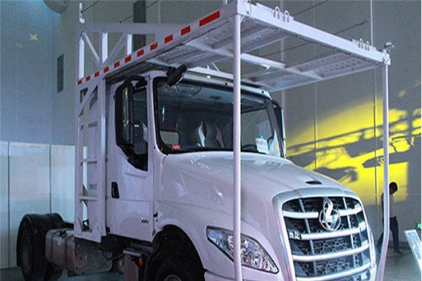 乘龍T5的長頭設計巧妙的利用了車頂的空間,因此相較于平頭轎運可以多裝一臺,讓愈發嚴格的轎運車在符合國內法規的前提條件下,可以多裝載一輛從而讓車主獲得更大的收益,當然要“多裝一臺”,并不是在駕駛室頂部加一個架子這么簡單,不僅僅要考慮整車的高度,還需要考慮頂上裝載的安全性以及平穩性。