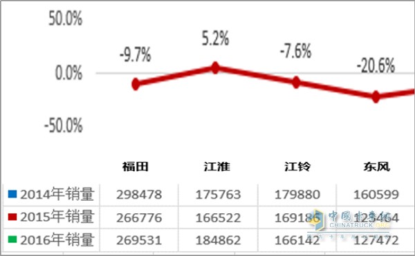 2014-2016幾大主流輕卡車企銷量增長率統計,數據來源:中汽協