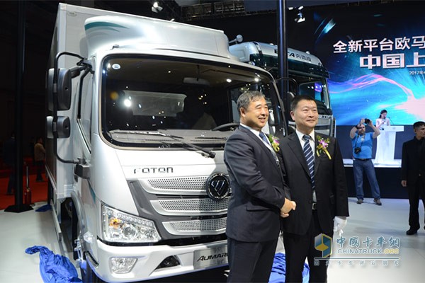 福田商用汽車集團(tuán)高級(jí)副總裁、歐馬可業(yè)務(wù)總監(jiān)、歐馬可事業(yè)本部本部長(zhǎng)顧德華先生和北京福田康明斯發(fā)動(dòng)機(jī)有限公司黨委書記詹振京為歐馬可S1超級(jí)輕卡首發(fā)揭幕