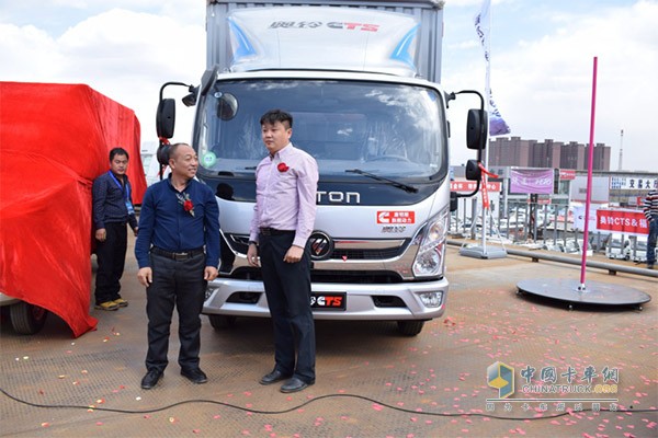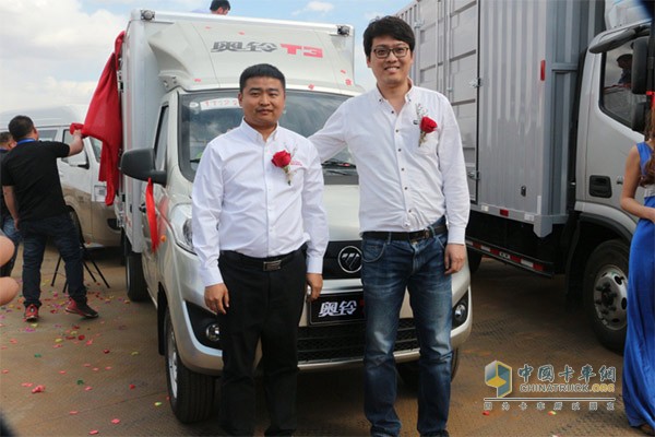 福田輕型商用車(chē)事業(yè)本部奧鈴營(yíng)銷(xiāo)傳播部部長(zhǎng)孫菲先生與百萬(wàn)公里名人堂用戶(hù)張玉先生為奧鈴CTS超級(jí)輕卡揭幕