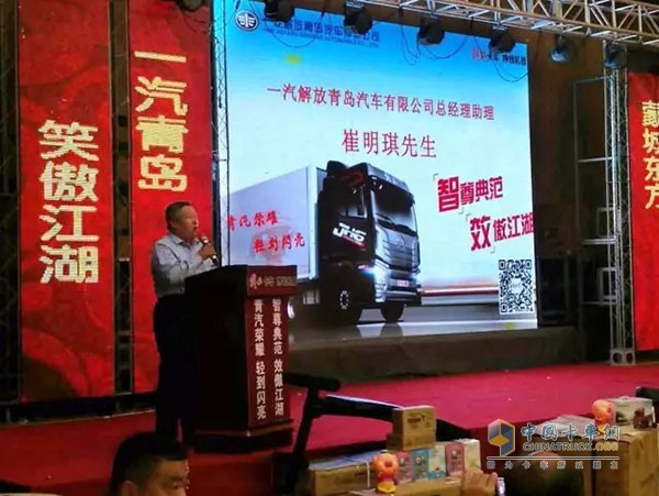 一汽解放青島汽車有限公司總經理助理崔明琪出席本次活動并發表致辭,他表示JH6產品受歡迎的根本來自于一汽解放從產品設計、生產制造、運行過程、售后服務等全生命周期的精心培育以及“產品性能領先”、“制造工藝領先”、“售后服務領先”、“智能科技領先”四大核心優勢。