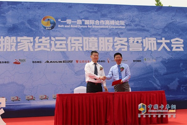 四通搬家除了聯合福田歐馬可為“一帶一路”國際合作高峰論壇提供貨運保障外,在誓師大會現場,還與歐馬可簽訂了200臺的戰略合作,并且將在后續服務的國家級外事保障任務中,與歐馬可繼續攜手,以其“國賓級物流保障用車”的高品質產品與服務,實現全程無憂的服務工作。
