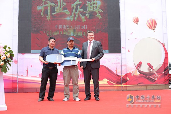現場還舉行了隆重的交車儀式,由廠家和經銷商管理層親自為客戶頒發鑰匙、并合影留念。值新店開業之際,德國曼恩陜西峻沃4S店為現場訂購的客戶準備了神秘的三重驚喜大禮包,陜西峻沃的團隊也在客戶面前做出了莊重的服務承諾,與會客戶中掀起了現場訂購浪潮。