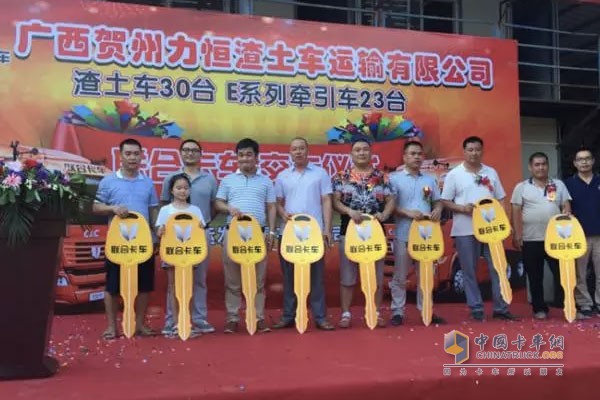 2017年7月15日,聯合卡車30臺智能渣土車及23臺E系牽引車交車儀式在風光秀麗的嶺南文化發源地賀州如期舉行。聯合卡車黔桂區域省區經理吳強會、服務經理姚宏玲,玉柴廣西辦市場部經理梁江、服務經理袁豐修、業務經理陶安民,聯合動力廣西區域經理麻昌鋒,南寧通超汽車銷售服務有限公司董事長陳海、總經理農校、桂東區域總經理黎文瑞,廣西賀州力恒渣土車運輸有限公司董事長朱記兵,個體運輸大客戶薛勇等新老客戶100多人出席本次活動。