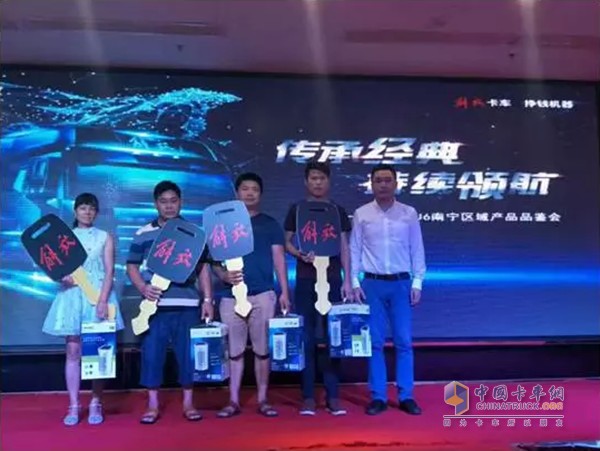 一汽解放新J6進入南寧卡車市場,取得了驕人的成績,活動當天還進行首批新J6訂車用戶代表的交車儀式,由一汽解放汽車銷售有限公司廣西商代處經理張立國先生為四名用戶代表頒發了鑰匙模型。