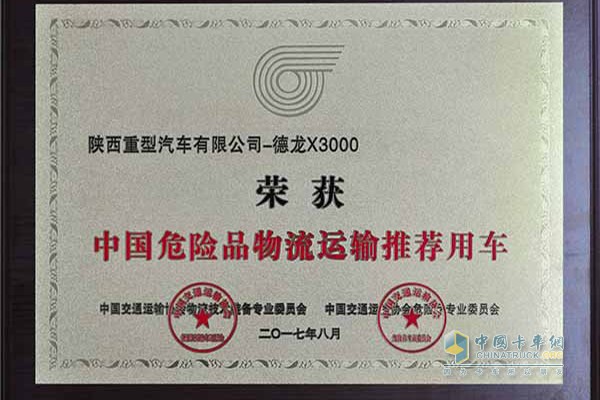 陜汽德龍X3000危險品牽引車榮獲2017年危險品運輸推薦用車
