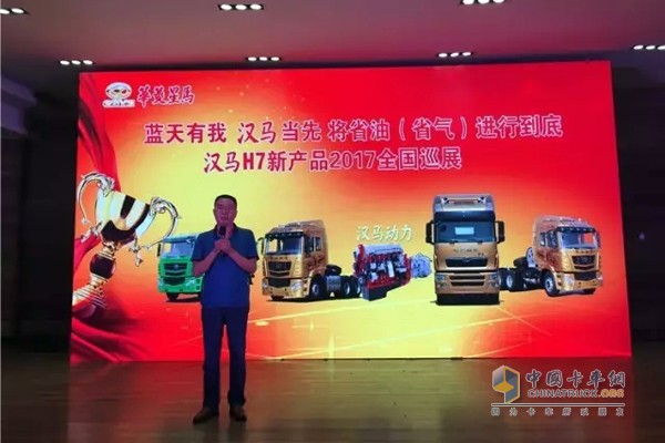 馬鞍山凱馬汽車零部件公司總經理孫紅軍出席本次活動。他在晚宴上發言時指出,物流運輸業是國民經濟的重要組成部分,牽引車承擔著物流運輸的重任。華菱星馬整合多年重卡的開發經驗,推出漢馬H7新品,我們的目的就是將最好的產品奉獻給廣大客戶,讓更多用戶富裕起來。我們承諾,當車輛出現故障時,一般故障24小時內給予解決,重大故障48小時內提供明確解決方案,符合三包條件不收任何費用。言簡意賅的一席話,博得現場喝彩聲不斷。