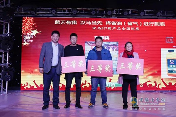 在活動現場,雖然寒風凜冽,但客戶了解產品的熱情不減,圍繞著產品詳細咨詢,華菱星馬工程師也就客戶關心的問題圍繞漢馬H7整車、發動機、變速箱作了詳細解答,部分客戶還啟動車輛試乘試駕,感受漢馬H7舒適的操控和澎湃的動力。與此同時,精彩紛呈的歌舞表演以及趣味互動搖一搖等抽獎互動節目,讓現場客戶參與活動的熱情不減。