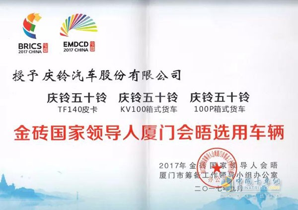 慶鈴系列汽車被授予金磚國家領導人廈門會晤選用車輛