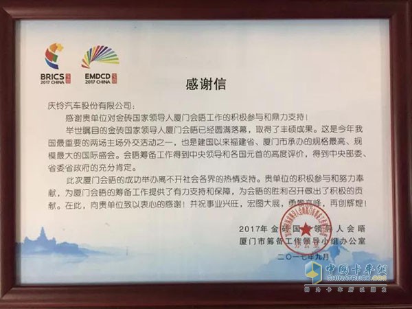 日前,來自“2017金磚國家領導人會晤廈門市籌備工作領導小組辦公室”的感謝信寄到了慶鈴汽車公司。