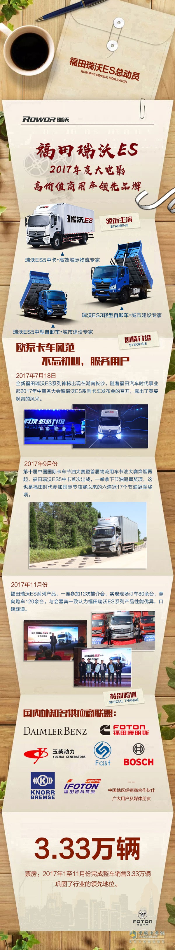 福田瑞沃ES全系出演年度大電影《福田瑞沃ES總動員》上映,這部電影講述了福田瑞沃2107年的光輝世紀,到2017年12月已經累計票房3.33萬輛,精彩內容敬請期待!