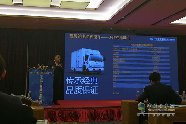 解放新能源產品管理部部長雷天祥做了題為《新能源城市物流車解決方案》的報告。報告中介紹了解放新能源基地先進的制造工藝和綜合實力,解讀了新能源卡車行業發展趨勢。從產品優勢、金融方案、政策支持等幾大方面詳細介紹了解放新能源產品。得到了與會嘉賓的一致認可和高度評價。