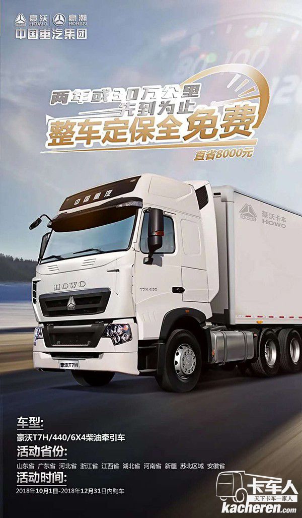 然而最近中國重汽針對豪沃T7H客戶又發(fā)了一波大福利,購豪沃T7H 440馬力 6×4柴油牽引車可享受兩年或30萬公里定保免費,免費,免費!可直省8000元!話不多說,快來了解一下活動詳情!