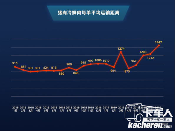 在“調豬”變“調肉”的政策建議下,一年來豬肉冷鮮肉貨運量漲勢明顯。2019年8月,豬肉冷鮮肉貨運量同比增長10倍,且平均運輸距離變得更長。一年時間,冷鮮肉每單平均運輸距離從900公里提升到1447公里,同比提升60.7%。