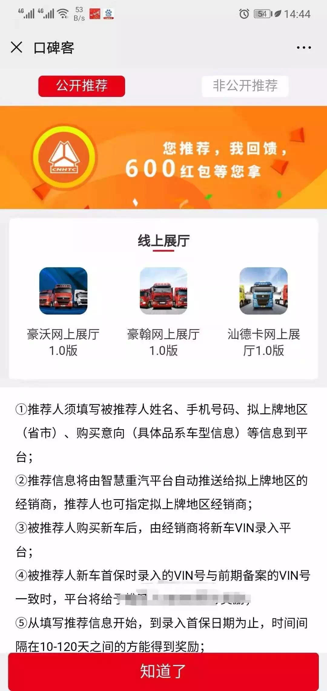 想把您的重汽客戶和小伙伴介紹來智慧重汽嗎?在不久的將來,我們還將推出口碑客的功能,推薦購車新戶來到智慧重汽,我們會為您準備一份積分豪禮,讓您的每一次傳播都可以得到我們感謝的回應(yīng)。