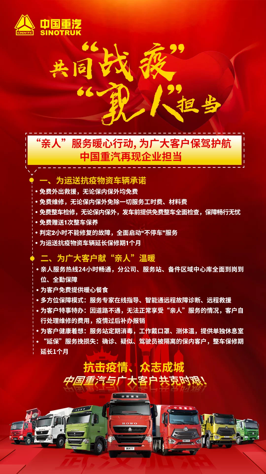 不畏疫情,勇敢前行,中國(guó)重汽服務(wù)如親人般一直在您身邊!疫情期間,中國(guó)重汽”親人”還為廣大客戶做出以下承諾,彰顯責(zé)任與擔(dān)當(dāng),與您一道眾志成城,共克時(shí)艱。