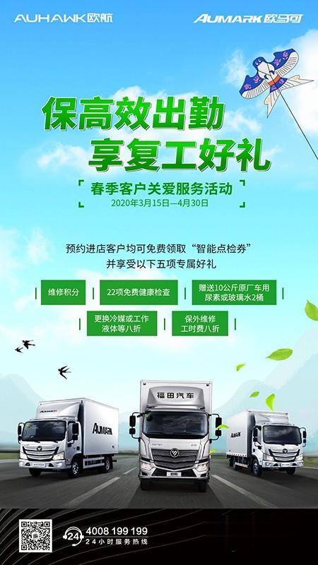本次春季關(guān)愛服務(wù)活動中,歐航歐馬可充分考慮“復(fù)工潮”及用戶春季保養(yǎng)的需求,為廣大用戶準(zhǔn)備了一系列貼心的服務(wù)。據(jù)悉,3月15日-4月30日,春季關(guān)愛服務(wù)活動期間進站客戶均可以成為歐馬可會員,不僅可以享受維修積分,還將獲贈10公斤原廠車用尿素或玻璃水2桶。同時,不僅冷媒、剎車油、玻璃水等工作液體一律8折優(yōu)惠,維修工時費同樣8折優(yōu)惠。此外,進站用戶還可通過福田e家APP領(lǐng)取“智能點檢券”,免費享受智能點檢服務(wù)。