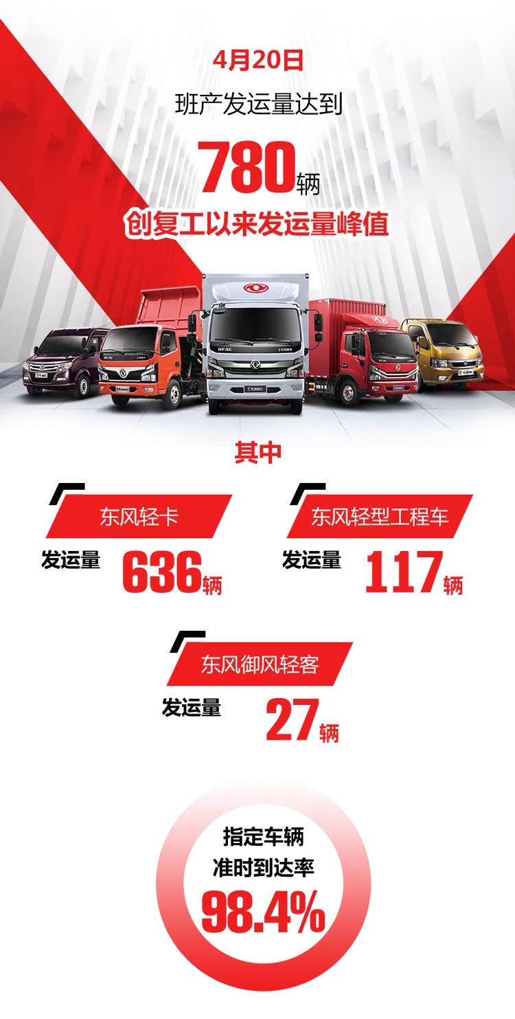 4月20日東風輕型車產品班產發運量達到780輛