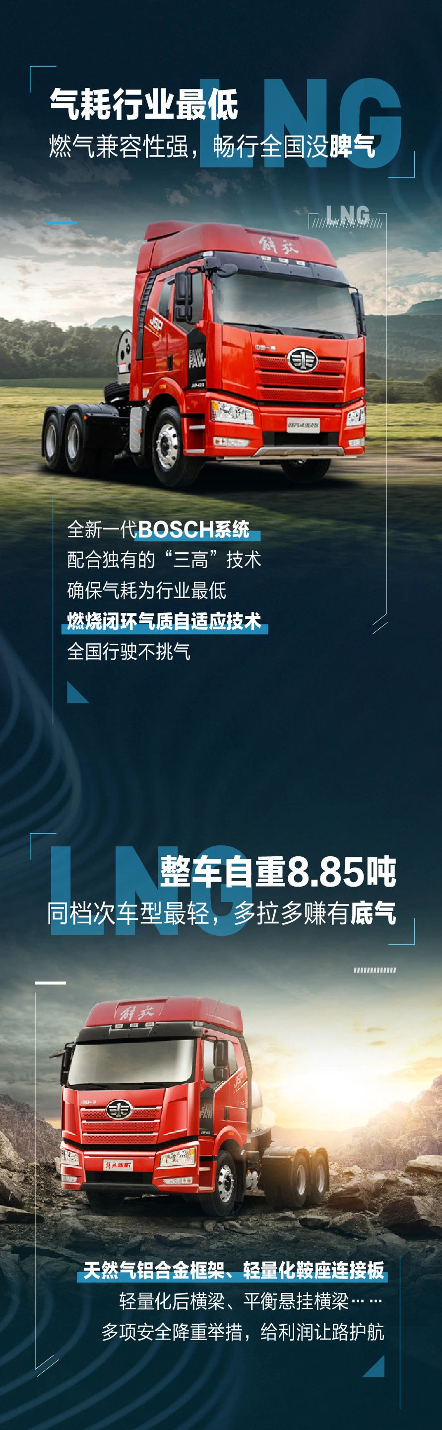 在當(dāng)下,卡友們都面臨著許多問(wèn)題,如國(guó)家排放要求越來(lái)越高,油價(jià)高,運(yùn)費(fèi)低等種種問(wèn)題。解放國(guó)六LNG牽引車,搭載國(guó)六發(fā)動(dòng)機(jī),無(wú)懼排放升級(jí)。整車氣耗低,燃?xì)饧嫒菪詮?qiáng),減輕自重讓你多拉多賺,一掃煩惱。
