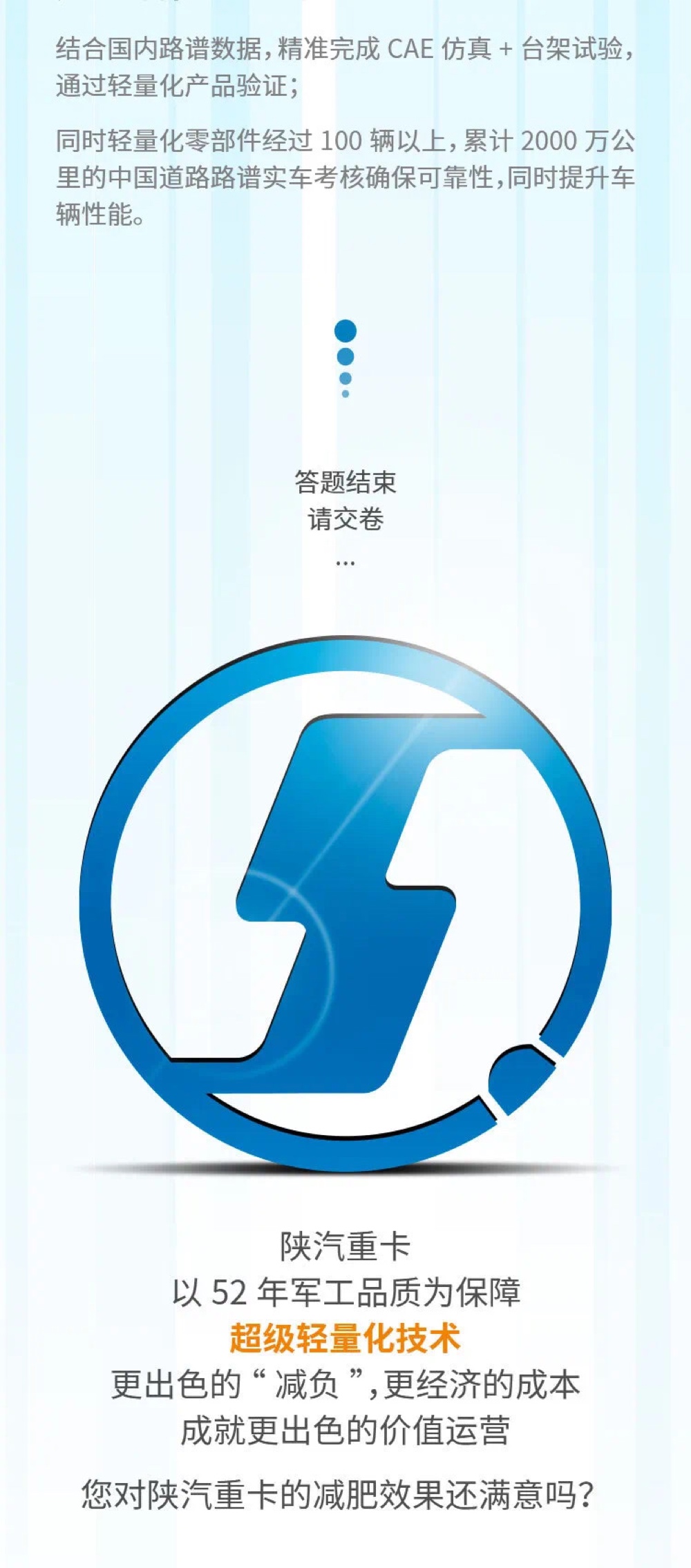 陜汽重卡以52年軍工品質為保障,超級輕量化技術,更出色的減負,更經濟的成本,成就更出色的價值運營。