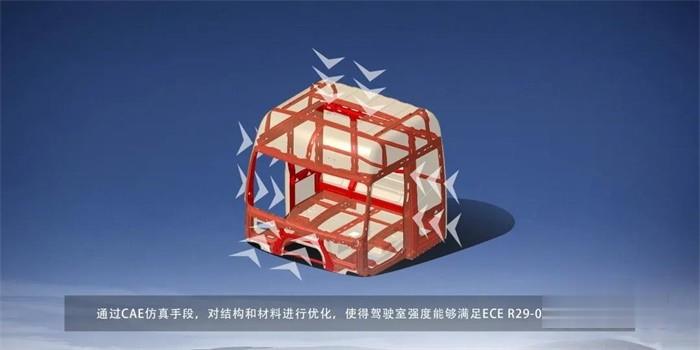 整車采用框架式高強度車身,并通過CAE仿真手段,對結構和材料進行優化,使得駕駛室強度能夠滿足ECE R29-03法規要求。