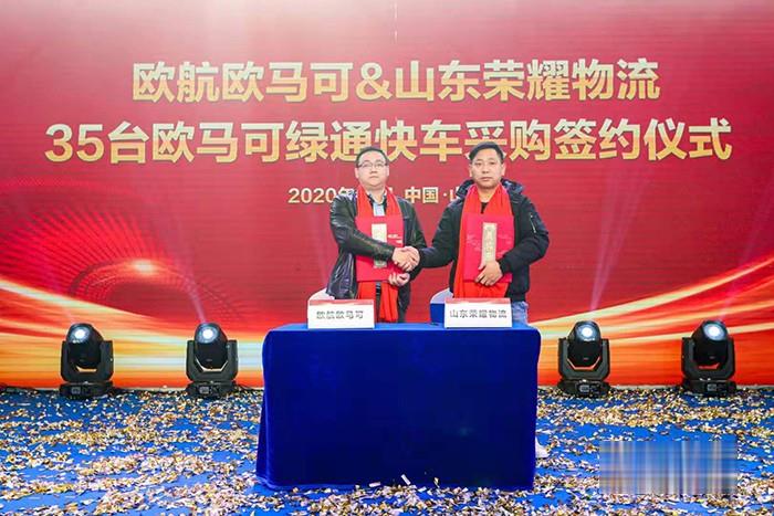 使用歐航超級卡車用于快遞運輸一年后,在2020年12月24日舉行的歐航歐馬可綠通定義車一體化解決方案發布儀式上,山東榮耀物流又牽手歐航歐馬可,簽訂了35臺歐馬可綠通快車采購協議。