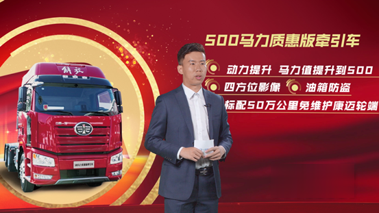 一汽解放市場部產品戰略室產品研究工程師范迪先生,在直播間向大家介紹了兩款2021年解放將重點推廣的新產品,第一款是500馬力的質惠版牽引車,標配四方位影像和油箱防盜功能,標配50萬公里免維護康邁輪端,標配800L油箱,選裝雙500L油箱,動力提升更是讓這款市場表現優秀的產品產生了質的飛越。
