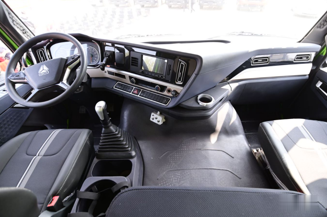 豪沃TH7駕駛室內部全新升級,內飾造型鮮明、功能分區合理,各種操作觸手可及,整個儀表臺采用流線型設計,非常符合人機工程學,同時,它的視野性能也得到了大大的提升,在國內處于領先水平,駕駛更安全;豪沃TH7系列標配空氣氣囊減震主座椅,可上下、前后、翻轉等多向調節,還有集成式座椅安全帶,為用戶提供前所未有的駕乘體驗;豪沃TH7標配彩屏儀表,信息顯示更加豐富清晰,故障信息即時顯現,人機互動更便捷,大大提高了行駛安全性和可靠性;標配16鍵多功能方向盤;標配高性價比7吋中控屏和標清四方位影像,追求高品質享受的用戶可選裝12.3吋中控大屏+360環視系統,當然追求經濟型的用戶可選裝MP3;全車標配窗簾導軌,標配抗污面料內襯,油污一擦即拭,非常方便;動力艙的高度也較以往降低了150mm,內部空間更大;一系列的細節設計,充分體現了中國重汽秉承的人文關懷設計理念。