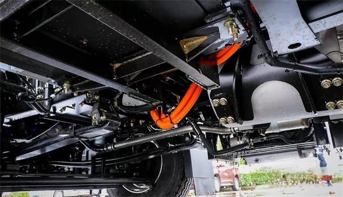 在傳動(dòng)系統(tǒng)方面,搭載法士特6E240電動(dòng)重卡專(zhuān)用自動(dòng)變速箱,后橋?yàn)?57后橋,速比為4.875。