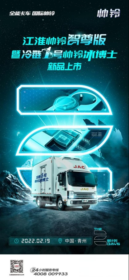 2022年2月19日,江淮帥鈴智尊版暨冷鏈1號帥鈴冰博士新品上市發布會將在山東青州正式舉行,屆時,搭載全新駕駛室造型的帥鈴智尊版與冷鏈1號帥鈴冰博士新品將正式與大家見面。