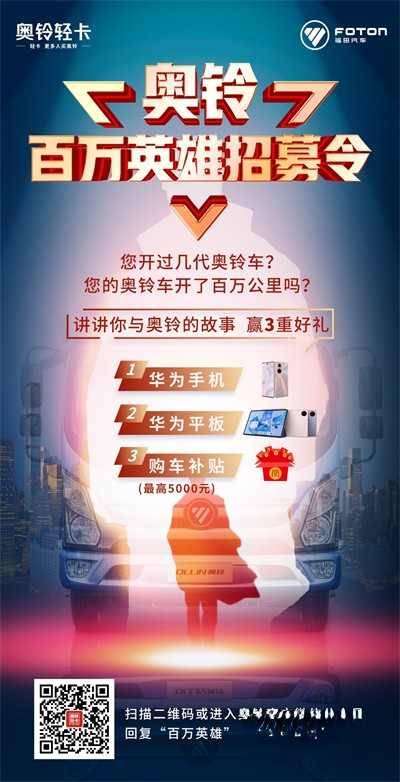 2022年8月28日, 奧鈴將舉辦百萬慶典活動,與百萬奧鈴卡友共賀盛事。與此同時,“奧鈴百萬英雄招募令”征集也在持續(xù)進行中。講講你與奧鈴的故事,贏三重好禮。卡友參與征集,將有機會獲得華為手機、華為平板,還有機會享受最高5000元購車補貼。奧鈴產(chǎn)品的百萬公里卡友和歷代資深卡友皆可參與,你有故事,我有禮遇,等您敘說!
