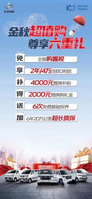 除了5.59萬的誠意起售價,長安凱程目前全系車型開啟促銷優惠,實實在在助力用戶輕松創富。現在購入長安睿行M60或其他車型,都能享六重金秋豪橫大禮,具體為: