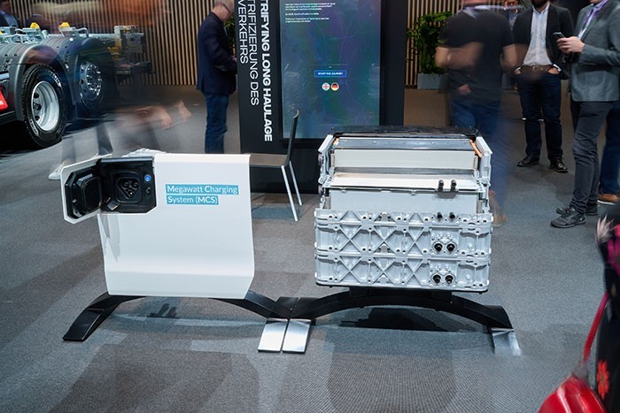 固定路線的卡車可在其自有停車場或固定目的地進行常規充電。斯堪尼亞在本次IAA展臺上也同時展示了一款配備由CHARIN聯盟提供的MCS快充系統的充電站原型機。MCS標準旨在實現1兆瓦以上的大功率充電,可在駕駛員45分鐘的強制休息期間對長途運輸卡車完成充電。目前,此標準還未完全確定。同時推出的一款安全性頗高的導電插頭,借助車輛上的標準位置,接口能進行自動充電。另外,接口可實現雙向V2X通信(車輛到電網等)。