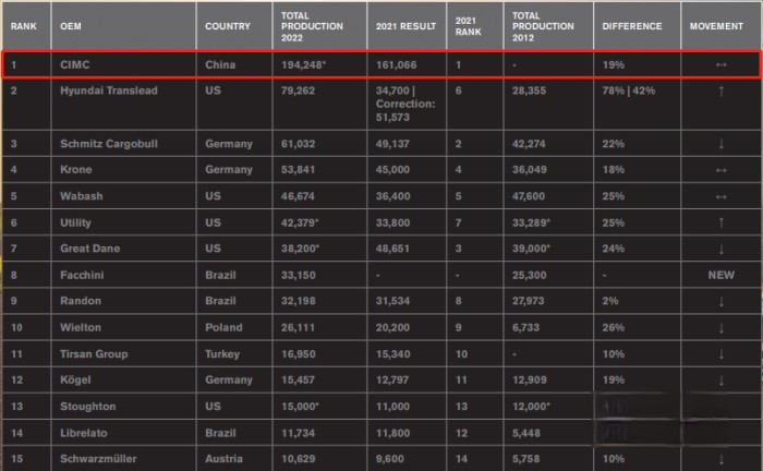 日前,全球半掛車知名雜志Global Trailer正式公布2022年全球前50名半掛車制造商按產量排名數據(2021年7月1日至2022年6月30日間)。中集車輛以19.42萬輛的產量再次蟬聯全球第一,是第二名Hyundai Translead產量(7.93萬輛)的2.45倍,是第三名Schmitz Cargobull產量(6.10萬輛)的3.18倍,成為榜單上唯一的一家中國企業。這也意味著,自2013年開始,中集車輛連續十年雄踞半掛車生產制造企業全球榜首。