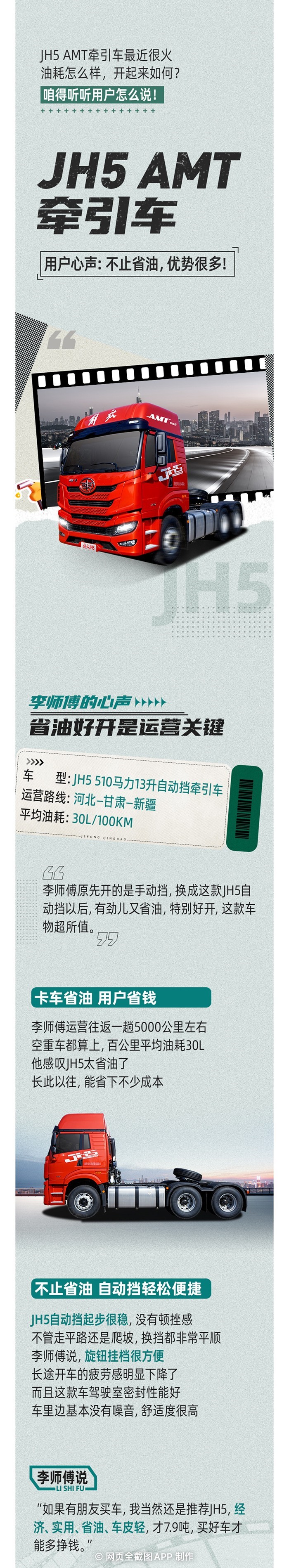 百公里平均油耗30L!解放青汽JH5自動檔牽引車不止省油,優勢很多!