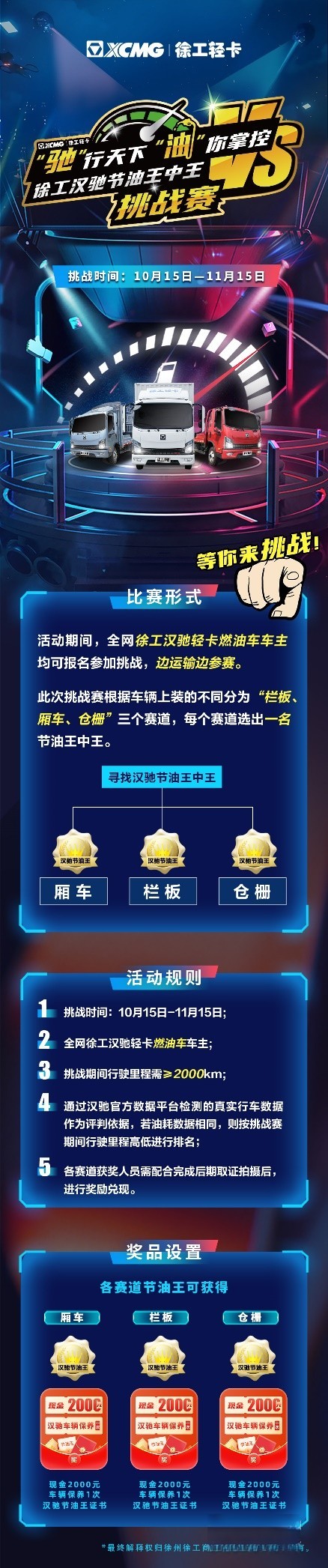 聚焦輕卡TCO,燃油消耗是全生命周期成本中占比最大的一部分,同時也是決定卡友收益價值的關(guān)鍵一環(huán)。面對當下車多貨少的物流運營環(huán)境,2023年10月15日,徐工汽車輕卡公司針對燃油車的欄板、廂車、倉柵市場啟動了【“馳”行天下·“油”你掌控 尋找徐工漢馳節(jié)油王中王】挑戰(zhàn)賽。
