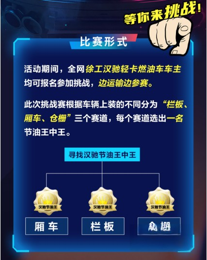 本次徐工輕卡尋找徐工漢馳節(jié)油王中王挑戰(zhàn)賽是面向全體徐工輕卡燃油車用戶展開,在“欄板、廂車、倉柵”三個賽道中,全國的漢馳車主或駕駛員均可報名、一較高低,展開油耗排名比拼,通過漢馳官方數(shù)據(jù)平臺檢測的真實行車數(shù)據(jù)作為評判依據(jù),若油耗數(shù)據(jù)相同,則按挑戰(zhàn)賽期間行駛里程高低進行排名,評選出各組節(jié)油王!