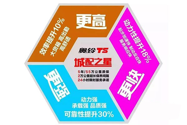 目前物流運輸現狀效率是“出行”的首要考慮因素,這對卡友們來說,非常重要。只有跑得更快,才能賺得更多。奧鈴TS在經典五十鈴基礎上,根據城市配送實際工況、速度,對動力特性、扭矩、油耗進行優化升級,升級后的新4JB1動力,功率提升10%,扭矩提升18%,經濟性提升10%。