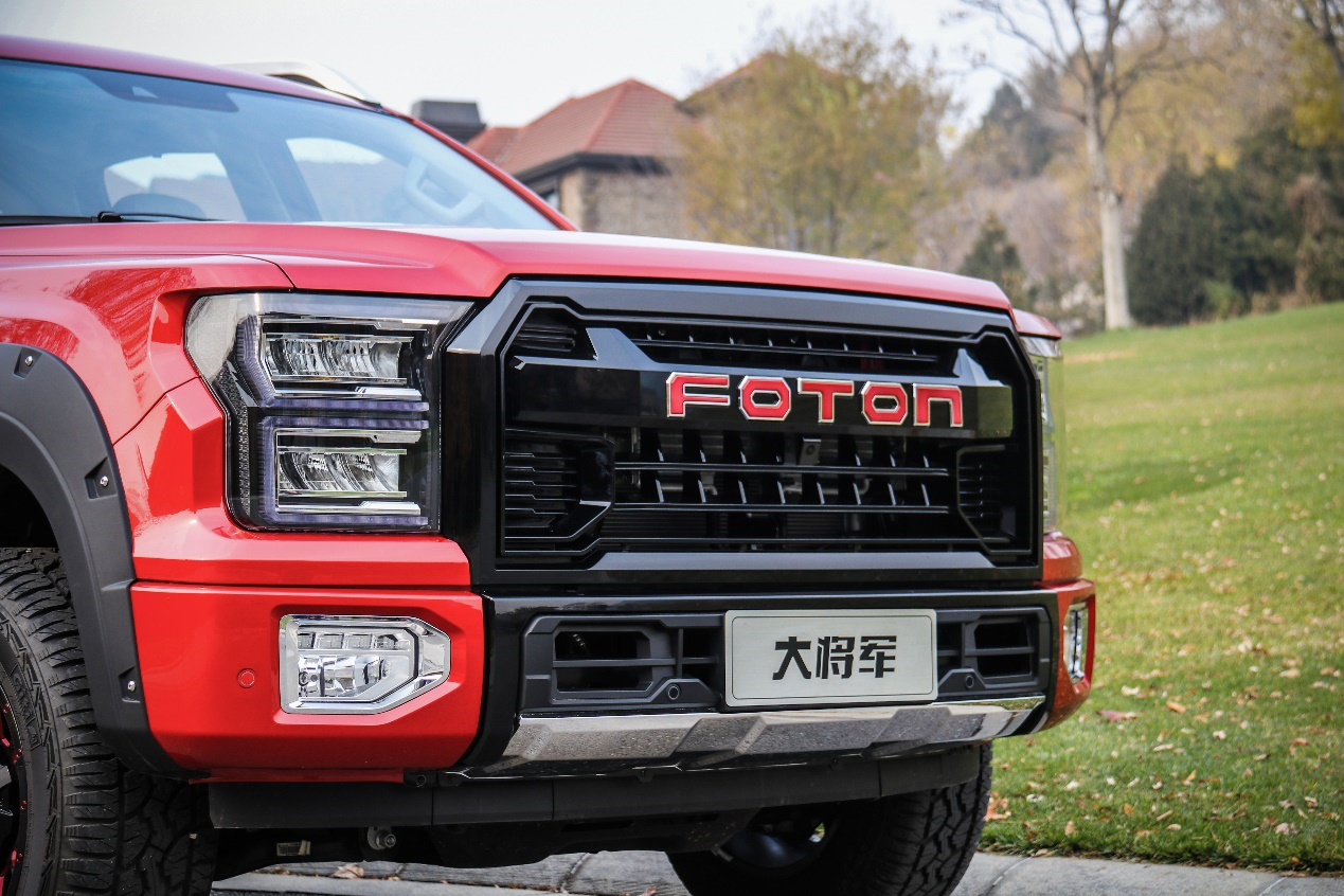 大部分人看到大將軍的第一眼會被它外觀所吸引,方正的車頭造型硬朗,與硬派越野車采用相同風格。此次實拍的是一臺運動版車型,進氣格柵采用熏黑設計,搭配內部粗壯的“FOTON”字母,造型相當霸氣。
