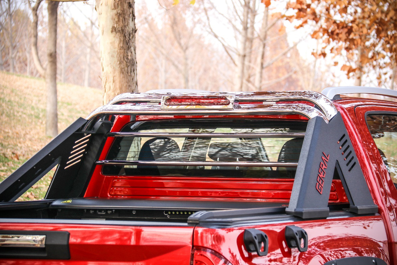 大將軍也帶有原廠的龍門架,采用黑色與銀色拼接設計,與車身達到了很好的融合,營造出越野風格。對貨物固定以及后窗的防護都起到了至關重要的作用。