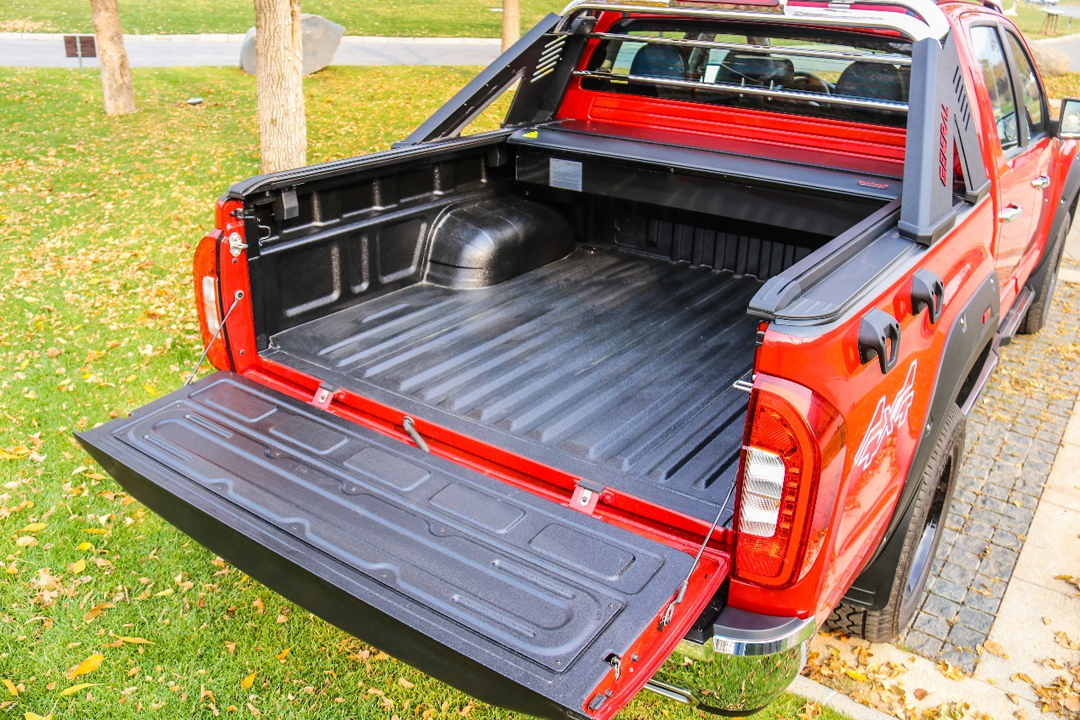 車尾采用簡潔風格,后保險杠采用鍍鉻風格,可以看出也是向進口高端皮卡看齊。由于是運動版車型,所以還采用了雙邊共兩出的排氣布局。不過要注意的是,左側排氣僅為裝飾,實際排氣為右側的排氣口。