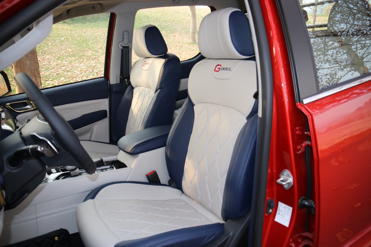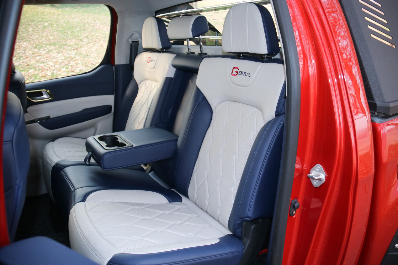 后排座椅最驚喜的是高度,沒有了以往皮卡后排那種“小板凳”的感覺,這也讓它的后排擁有不錯的乘坐舒適性,更適合長途乘坐。大將軍車寬達到1980mm,駕駛室內寬則達到了1520mm,這也讓其擁有優秀的橫向空間表現,后排坐滿3個人,輕輕松松。大將軍兩側采用了超大面積車窗也是其一大特色,讓車內人員擁有更寬闊的視野體驗。