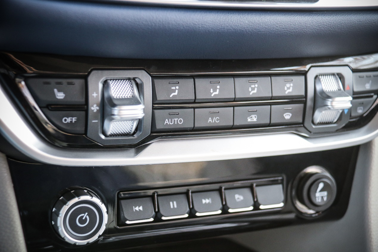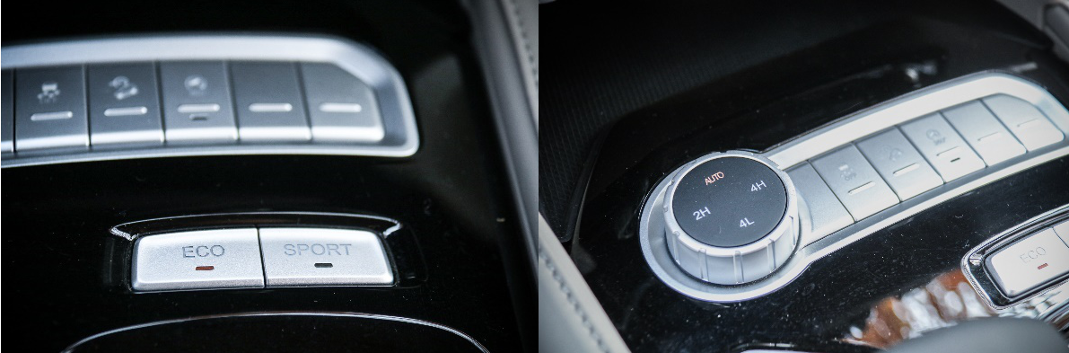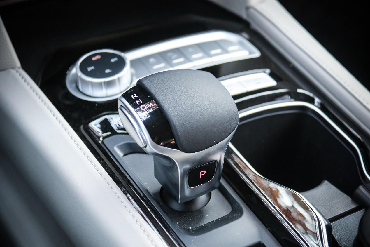大將軍的四驅模式可通過中控T字區下方的旋鈕進行調節,分別為智能模式、兩驅、四驅和低速四驅,滿足不同用車工況。車身穩定控制、陡坡緩降等功能也可通過右側按鈕控制。同時,大將軍也提供ECO模式與SPORT模式,可通過按鍵進行切換。